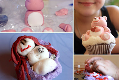 This little Care Bear on a cloud cupcake was super fun to make and even more fun to give to my niece. After she saw it, she wanted to know what he was made of, if she could eat it, and then, if she could have some to play with. So of course, this made me really happy to see her excited. Anyway, I gave her some red and white fondant, some candies and sprinkles. Then, I was asked to leave the room. When she gave me permission to return, she had made the cutest little cupcake snow woman for me. And that’s snow woman (not girl) hence the long red hair, I was informed that she was holding a token chocolate candy for me, too. So cute!
